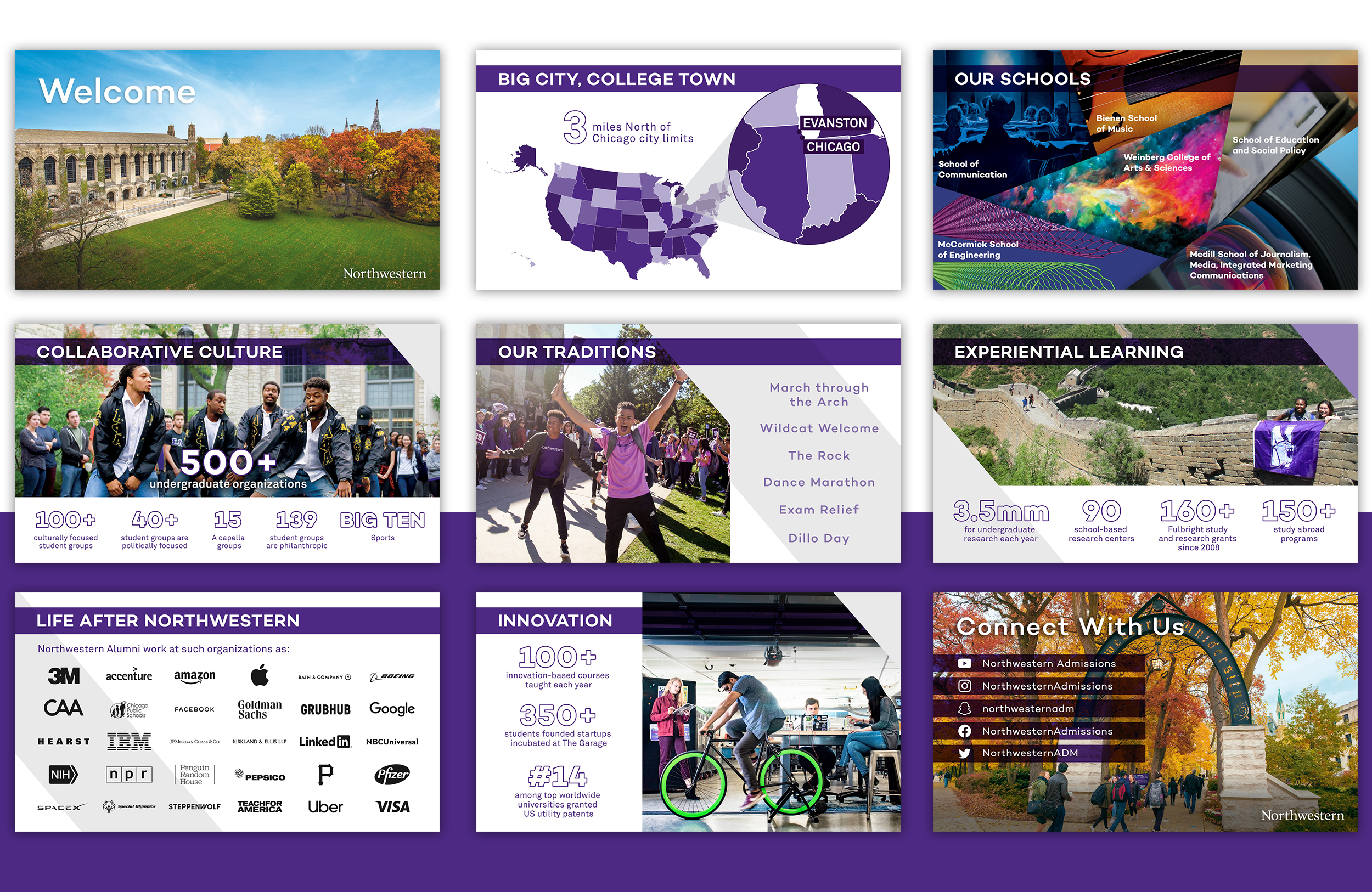 As the senior graphic designer at Northwestern University, I serve as the brand manager for the university and provide art direction and design for Northwestern as well as sub-brands such as schools, offices and departments. I work on a wide variety at Northwestern, from brand projects in environmental, print, and digital, to telling Northwestern’s story and rolling that out on multi-channel platforms. Below are highlights of work or brand projects for Northwestern University that span over variety of mediums and channels.